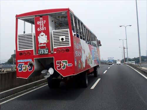 道の駅「まくらがの郷・こが」の朝。 今日は薄曇り、昨日よりは涼しくなりそうだ。 ゆっくりと北上を開始した。 珍しい水陸両用自動車に出会った。 車体には、「ダックツアー 長崎県島原市✕青森県西目屋村 共同観光プロモーション」と書かれている。 長崎か…