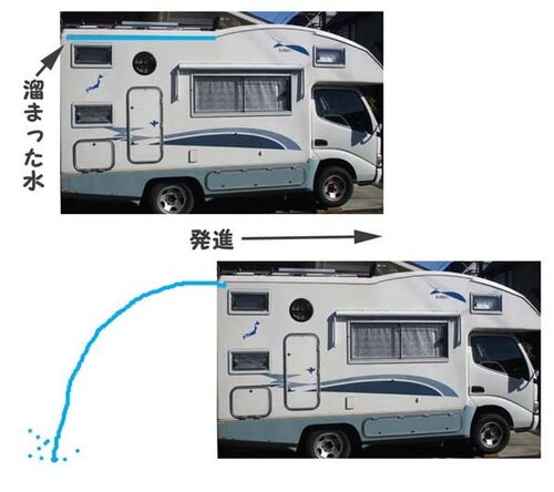 あれこれ「快適化」を遊びネタにしているが、「リスクにご注意」という意味のコメントを頂戴した。 実は、突き出し雨樋については懸念していることがある。 車の雨樋に水が溜まった状態で発進すると、水が雨樋から後方に流れ出るのである。 後ろからこの様子…