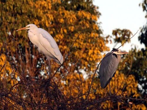 毎日ウォーキングしている土手道で、不思議なサギを見つけた。 左が問題のサギ。 身体の特徴からはダイサギなのだが、翼が不思議な薄青色をしている。 右は普通のアオサギである。 夕日を浴びているので光線のイタズラかもしれないと思い、少し歩き回って見…